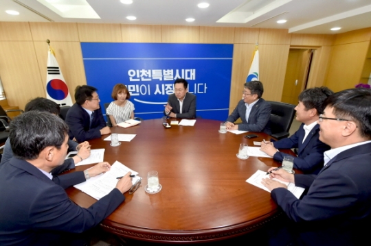 박남춘 인천시장이 지난 1일 집무실에서 박상우 한국토지주택공사 사장을 면담하고 있다. (사진/인천시)