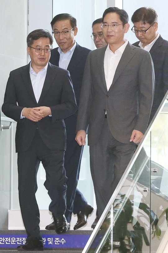 김동연 경제부총리 겸 기획재정부 장관(왼쪽)과 이재용 삼성전자 부회장이 6일 오후 경기도 평택시 삼성전자 평택캠퍼스에서 열린 간담회를 마치고 나서고 있다./뉴시스
