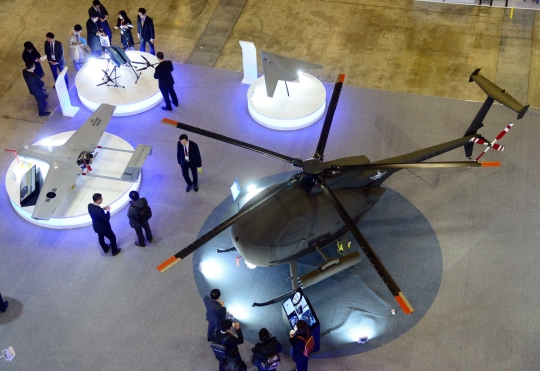 부산 벡스코에서 열린 '2017 드론쇼 코리아'를 찾은 관람객들이 대한항공 부스에 전시된 무장운용 무인 헬기, 하이브리드 추진시스템 드론, 차세대 스텔스 무인전투기 등 다양한 군용 무인기를 구경하고 있다./뉴시스