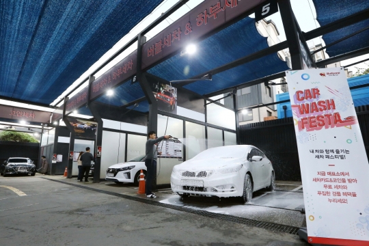 불스원 세차데이 '카 워시 페스타' 행사 참가자가 차량 세차를 진행하고 있다.