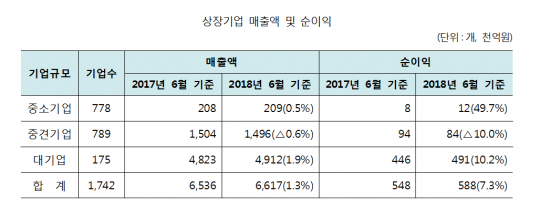 상장기업 중에서 중견기업은 789개사로 전체의 45.3%를 차지한다. 중소기업은 778개사(44.7%), 대기업은 175개사(10%)다.