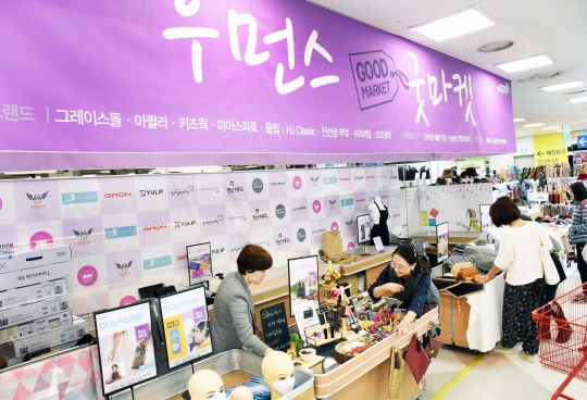 17일 수원 홈플러스 영통점에서 열린 '우먼스 굿마켓'에서 여성기업들이 육아와 가사에 도움을 주는 다양한 상품을 선보이고 있다. /홈플러스