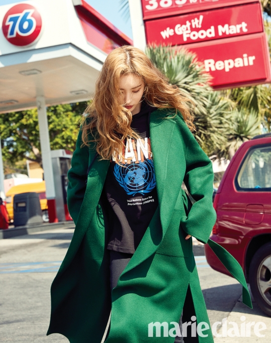 공개된 화보 속 선미는 비비드한 그린컬러의 리버시블 코트에 캐주얼한 블랙 후디를 매치하여 꾸민 듯 안 꾸민 듯 한 내추럴한 패션을 완성하였다.