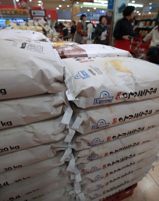 22일 오후 서울 시내 한 대형마트에 쌀 포대가 진열돼 있다.10월 쌀값은 공급량 감소로 80㎏당 19만3천∼4천원을 기록해 수매제에서 공공비축미 매입제로 변경된 지난 2005년 이후 13년 만에 역대 최고치를 나타냈다. /연합