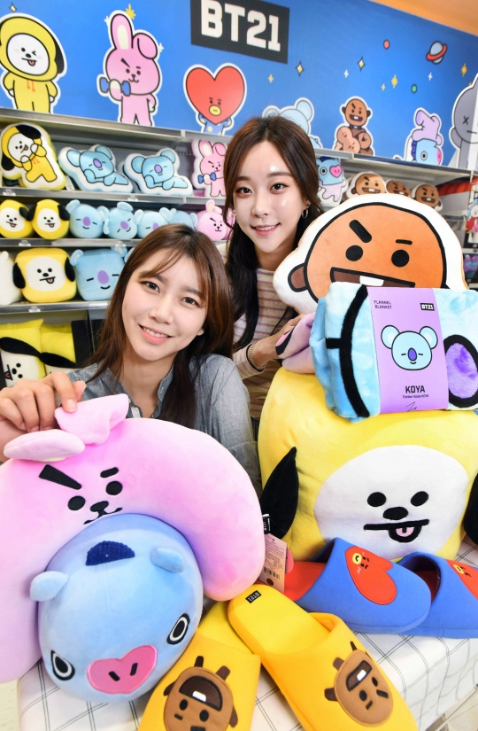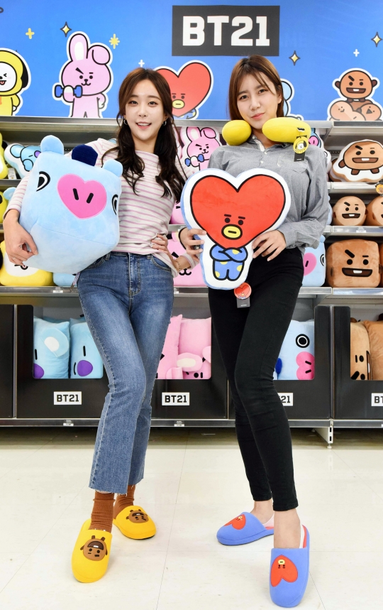 모델들이 25일 서울 등촌동 홈플러스 강서점에서 BT21 캐릭터 상품들을 선보이고 있다. 홈플러스는 글로벌 캐릭터브랜드 라인프렌즈와 방탄소년단(BTS)이 컬래버레이션해 탄생시킨 'BT21' 캐릭터의 리빙 상품 49종을 판매한다. 특히 홈플러스에서 론칭한 담요, 거실화, 목쿠션 등 49종의 BT21 캐릭터 상품은 국내 오프라인 채널에서는 오직 홈플러스에서만 선보이는 디자인이다./홈플러스