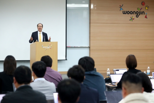 "(웅진을) 다시 일으키게 한 것은 사랑하고 또 사랑하고, 또 사랑하라는 그룹의 철학인 '또또사랑'이 있었기 때문이다. 사랑하는 만큼 힘을 주고 뭉치면 작은 회사지만 더 커질 수 있다고 생각한다. 사랑도 신뢰가 지속돼야 가능하다. 신뢰는 투명경영을 통해서 실현된다."
