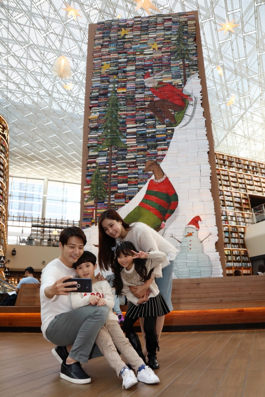 5일 오전 서울 삼성동 스타필드 코엑스몰 별마당 도서관에 크리스마스 시즌을 앞두고 1만 4천여 권의 책을 쌓아 만든 초대형 '별마당 북트리'가 선을 보인 가운데 모델과 아이들이 북트리에 대한 안내책자를 읽고 있다./이마트