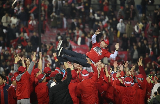 최태원 SK 회장이 SK와이번스 선수단에게 헹가레를 받고 있다. /뉴시스