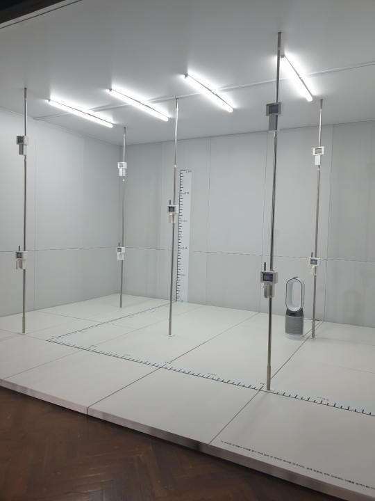 다이슨이 행사장에 재현한 폴라테스트 공간. 27㎡ 공간에 센서를 9개 장착했다. 공기청정 제품과 오염 요인을 양쪽 끝에 두어서 실제 주거 환경을 최대한 반영했다는 설명이다. /김재웅 기자