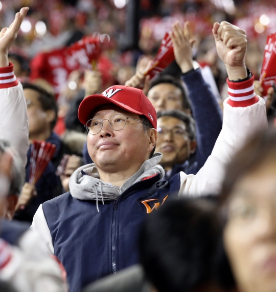최태원 SK 회장은 38세인 1998년 회장직을 맡아 아직 50대 젊은 총수다. 지난달 프로야구 한국시리즈 6차전을 관람하는 최 회장. /뉴시스