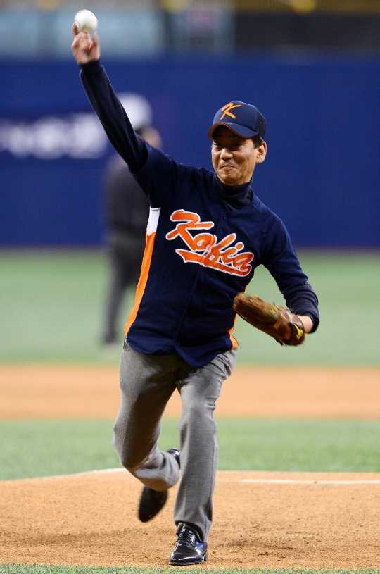 지난 8일 서울 고척돔에서 열린 제6회 금융투자협회장배 야구대회 올스타전에서 권용원 금투협회장이 시구를 하고 있다./금융투자협회