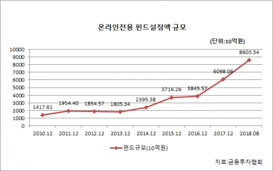 16일 금융투자협회에 따르면 지난 13일 온라인 전용 펀드 시장의 기준 설정액은 8조8434억원을 넘었다. 지난해 말 6조1000억원과 비교하면 올해만 44% 이상 늘어났다. 온라인 전용 펀드 시장은 이제 9조원 시대를 앞두고 있다.