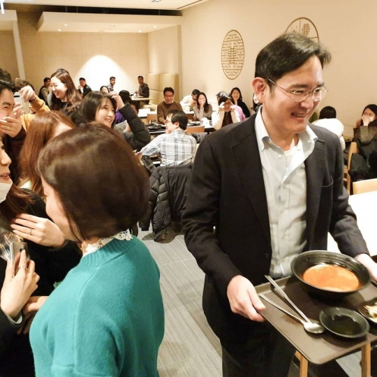 특히 이날 점심에는 이 부회장이 고동진 사장과 전경훈 부사장 등 경영진들과 함께 구내 식당을 찾아 파격 행보를 보였다. 수행인력도 배치하지 않고 구내 식당에서 직원들과 친근하게 인사를 나눴으며, 짬뽕을 한그릇 먹은 후 자리를 떴다.