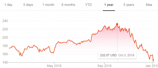 애플 주가는 작년 10월 이후 곤두박질치는 중이다. /구글 캡처