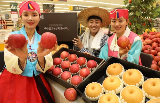 올해 설 사전예약(12월13일~1월10일 기준)은 '피코크 고당도 장수 사과'가 지난해 동기간 대비 300% 증가, '피코크 천안 100년의향기 배'가 320% 증가했다.