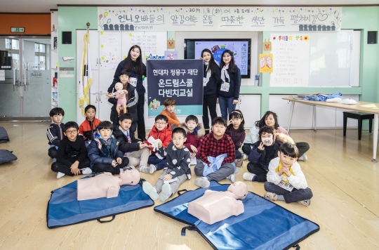 온드림스쿨 다빈치교실 겨울방학 수업에 참여한 학생들이 대학생 교사가 진행하는 구급법 수업에 참여하고 있다.