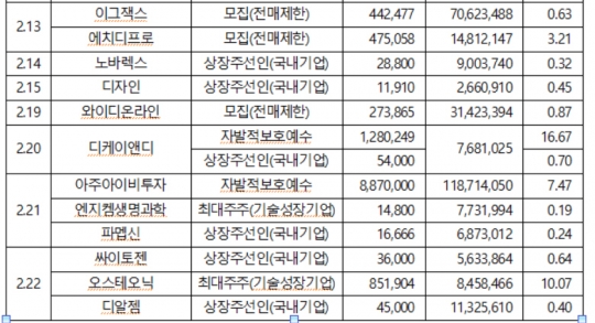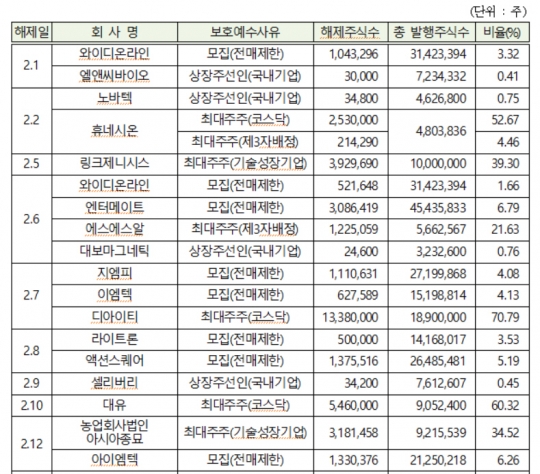 2019년 2월 코스피시장 의무보호예수 해제주식 내역/자료=한국예탁결제원