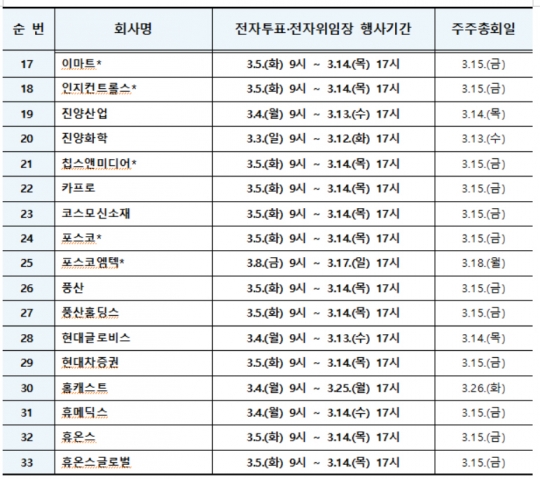 3월 둘째주(3월3일~9일) 전자투표·전자위임장 일정현황/자료=한국예탁결제원