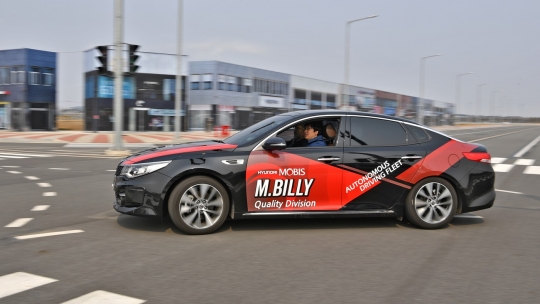 현대모비스가 서산 주행시험장에서 얀덱스 임원들이 현대모비스가 시험운행하고 있는 자율주행차를 직접 체험해보고 있다.