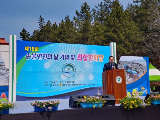 지난 13일 개최된 제18회 손불면민의 날 기념식에서 이윤행 함평군수가 축사를 하고있다. (사진제공=함평군)