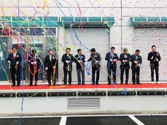 프로톡스 바이오 생산공장 준공식이 25일 열린 가운데 시너지파트너스 구자형 회장(왼쪽 네번째), 디에스케이 바이오부문 김종원 대표(왼쪽 다섯번째), 프로톡스 이동범 대표(왼쪽 일곱번째)를 비롯한 참석자들이 테이프 커팅을 하고 있다./사진=배한님 기자