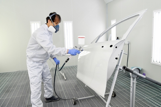 보쉬카서비스 식사점 창성모터스 3층에 자리한 판금, 도장 시설에서 엔지니어가 도색작업을 진행하고 있따.