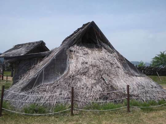 청동기시대의 사람 형태의 조형물이 땅에 넘어져 있다.
