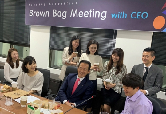22일 서울 여의도 한양증권 본사에서 임재택 한양증권 대표(가운데)가 직원들과 함께 브라운백 미팅을 갖고 있다./한양증권