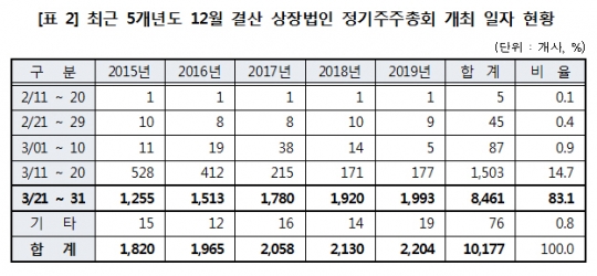 30일 한국예탁결제원에 따르면 최근 5년 동안 주총을 개최한 총 1만177개사를 분석한 결과 8461개사가 3월 21일에서 31일 사이에 주총을 연 것으로 나타났다. 83.1%로 압도적인 비중이다.