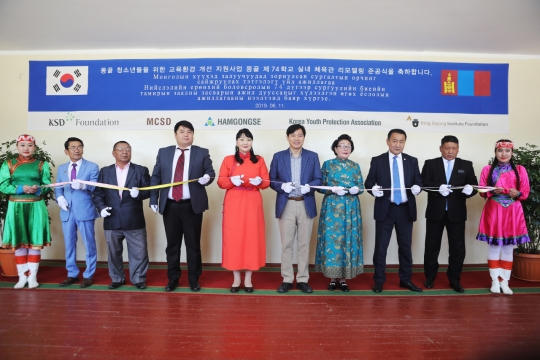이병래 KSD나눔재단 이사장(왼쪽 여섯번째)이 제74학교 실내복합시설 준공식에서 관계자들과 테이프 컷팅을 하고 있다./한국예탁결제원