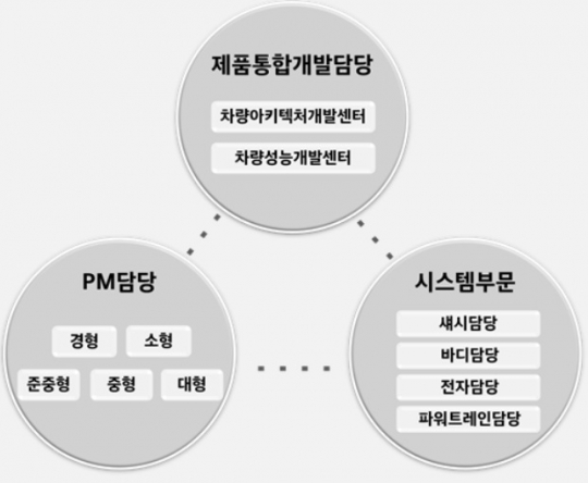 아울러 제품개발을 총괄하는 PM담당은 제품통합개발담당에서 만들어진 차량의 기본 콘셉트를 바탕으로 차량의 각 시스템 부문에서 개발한 기술을 차급과 브랜드별로 최적화해 상호 간섭을 막고 차별화된 제품개발을 책임진다.