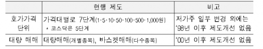 거래소는 우선 98년 이후 큰 변화가 없었던 호가가격 단위를 호가분포 상황에 대한 실증 분석 이후 해외 사례를 참조해 조정방안을 마련하고, 대량매매 편의성을 높이기 위해 대량매매시스템(K-BLOX)의 거래조건 입력 방법 및 경쟁대량매매의 가격결정 방식을 개선하는 방안을 검토하고 있다.