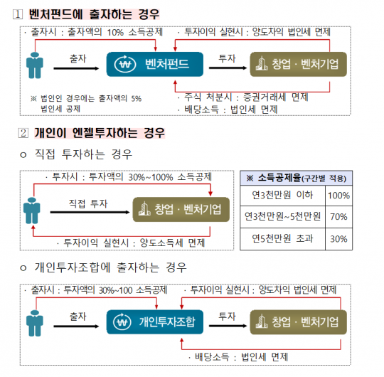 개인이 엔젤투자를 하면 연간 기준으로 5000만원 초과는 30%, 3000만원 초과~5000만원 이하는 70%, 3000만원 이하는 100% 소득공제를 받을 수 있다. 정부는 100% 소득공제 기준을 기존 1500만원 이하에서 지난해부터 3000만원 이하로 확대했다.