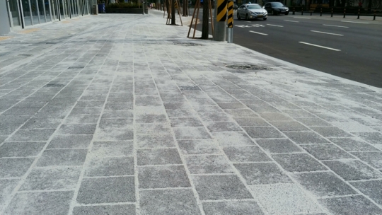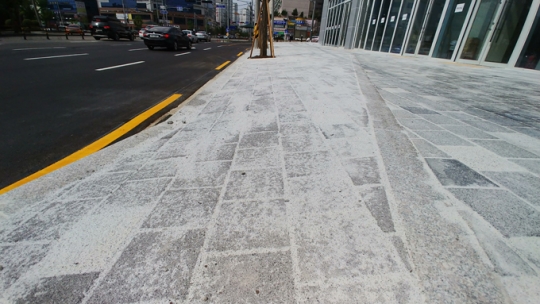 현장소장은 "유리가루같은 것은 모래다. 비가 오면 보도블록 틈새에 스며들면서 다져지도록 깔아놓았다. 노면이 울퉁불퉁한 부분은 확인 후 시정하겠다."고 해명했다.