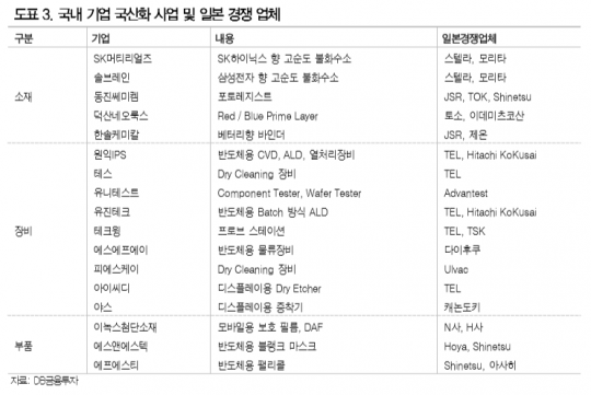 DB투자증권의 어규진 연구원은 "일본이 주력으로 공급하는 제품군 속 국산화를 시도하고 있는 업체들에 지속적 관심을 가질 필요가 있다. 해당 업체들이 국산화에 성공할 경우 실적이 큰 폭으로 상승할 수 있다"고 설명했다.