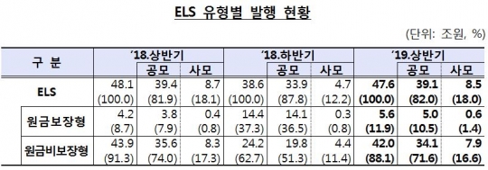 상반기 기준 ELS 잔액은 76조1000억원으로 지난해 말 대비 3조2000억원 증가했다. 잔액은 공모(2조8000억원), 사모(4000억원), 원금보장형(1조2000억원), 원금비보장형(2조원) 모두 증가했다.