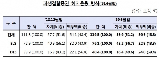 상반기 파생결합증권의 자체헤지와 백투백헤지의 비중은 각각 51.2%(59조6000억원)와 48.8%(56조9000억원)로 지난해 말과 비슷했다.