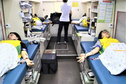 신천지 자원봉사단 서울동부지부 단원들이 헌혈을 위해 헌혈차에서 대기하고 있다./ 신천지자원봉사단 서울동부지부
