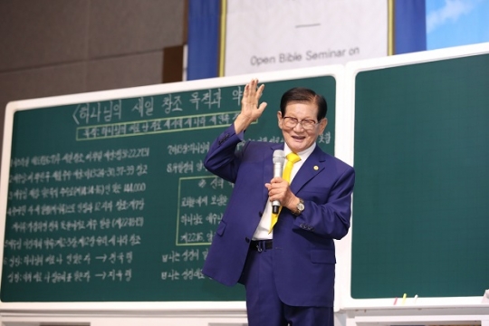 이만희 총회장이 대구 호텔인터불고 컨벤션홀에서 '주 재림과 추수 확인 대집회'에서 강연을 하고 있다./신천지예수교회