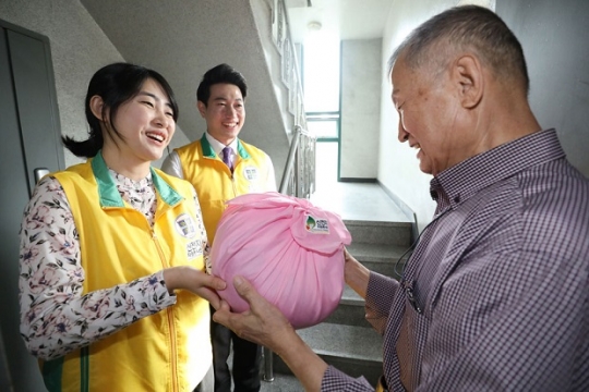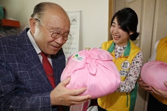 신천지봉사단서대문지부에서는 소외된 이웃들에게 핑크보자기를 선물해 사랑과 감동을 주고 있다/신천지자원봉사단