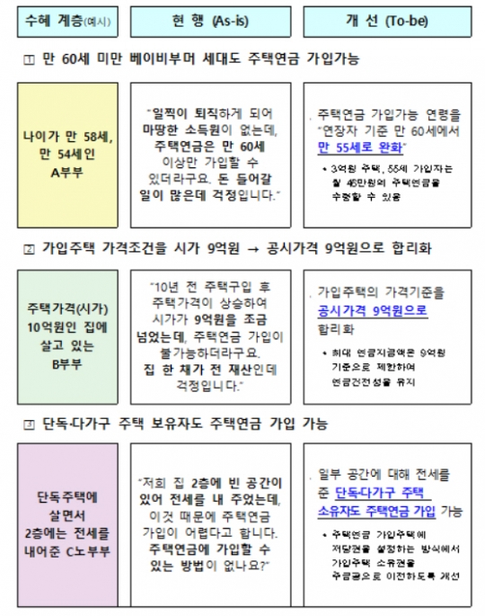 방안에 따르면 먼저 주택연금 가입연령을 60세에서 55세로 낮추고 주택가격은 시가 9억원에서 공시가 9억원으로 높인다.
