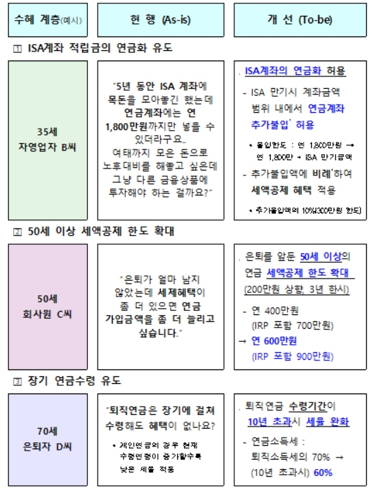 청년층과 장년층이 연금에 가입할 수 있도록 세대별 맞춤형 지원도 확대한다. 청장년층의 경우 개인종합재산관리(ISA)계좌의 만기도래시 계좌금액 내에서 개인연금 추가불입을 허용하고, 세제혜택도 부여한다. 50세이상 장년층의 경우 개인연금 (IRP포함) 세액공제 한도를 연 200만원으로 늘린다.