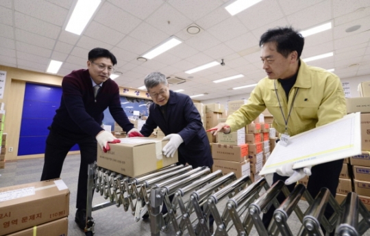 도성훈 인천광역시교육감(좌측 첫번째)과 장우삼 인천광역시부교육감(좌측 두번째)이 14일 새벽 대학수학능력시험 문답지를 운반 차량으로 운반하기 위해 보관소에서 옮기고 있다. (사진/인천시교육청)