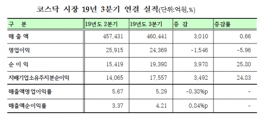 코스닥 상장사들의 3분기 누적 기준 영업이익은 정보통신(IT) 기업들의 선전 속에 지난해보다 2.69% 늘었다. 이들의 3분기 누적 매출액은 133조 8951억원으로 지난해 같은 기간과 비교해봤을 때 8.97% 증가했다. 반면 누적 순이익은 같은 기간 2.89% 줄어든 5조659억원을 기록했다.