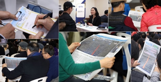 지난 23일 오후 서울 동작구 신천지예수교 증거장막성전(신천지예수교회) 시몬지파 영등포교회에서 열린 말씀대성회에서 참석자들이 후속상담 신청서를 작성하는 모습. 신문에 보도된 신천지예수교회 기사들 / 신천지예수교