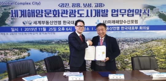 사)미래해양수산포럼(이사장 박병종)이 세계부동산연맹 한국대표부(회장 지태용)와 강진, 장흥, 보성, 고흥군 해안선에 내륙화 '세계해양문화관광도시' 유치와 관련해 업무협약식을 가졌다고 26일 밝혔다.