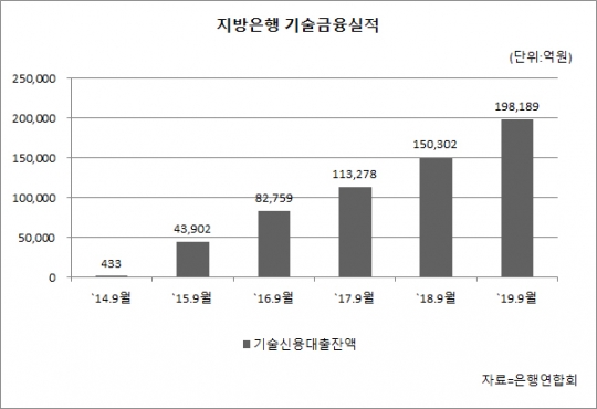 2일 은행연합회에 따르면 9월 기준 6대 지방은행(경남·광주·대구·부산·전북·제주은행)의 기술금융 실적은 19조7411억원(4만5210건)이다. 지난 2015년 9월 4조3571억원에서 3.3배(15조3840억원) 증가한 수준이다. 부산은행과 대구은행은 각각 6조5449억원, 6조1786억원 공급해 1·2위를 기록했다.