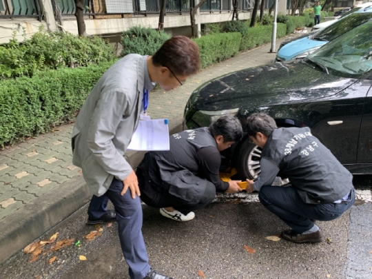 체납차량에 족쇄를 채우고 있다./사진 강남구청