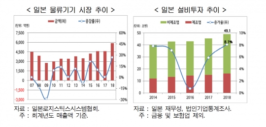 현대경제연구원이 5일 펴낸 '일본 물류기기 동향과 시사점' 보고서에 따르면 2018년 일본의 물류기기 시장은 전년에 비해 26.6% 급등하며 사상 최고인 5859억엔까지 성장했다.