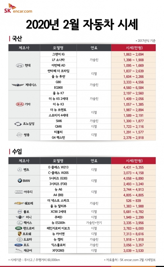 국내 최대 자동차 거래 플랫폼 SK엔카닷컴이 2020년 2월 중고차 시세를 7일 공개했다. 이번 공개된 중고차 시세는 현대차, 기아차, 르노삼성, 쌍용차 등 국내 완성차 브랜드와 BMW, 벤츠, 아우디 등 수입 브랜드의 2017년식 인기 차종의 중고차 시세다.